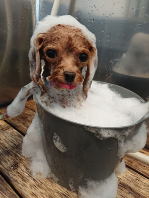 ちいちゃなニコちゃんはシャンプーの泡を作る小さなバケツにもすっぽり♡