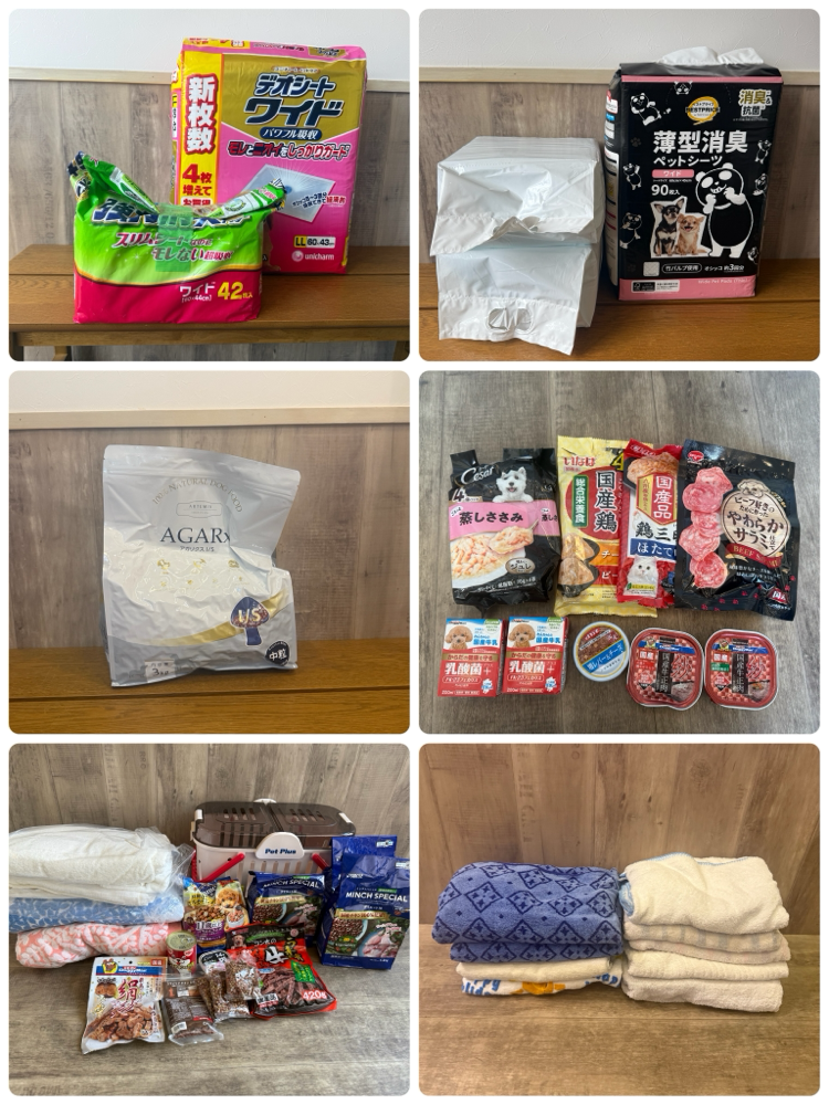 タオル、ブランケット、ペットシーツ、未使用の中型犬以上の首輪とリード、未使用のおもちゃ