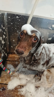 シャンプーをするとお鼻に詰まった固まった鼻水がふやけて取れて、いつもトリミングが終わるころには呼吸が楽そうだね(^^)