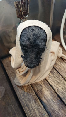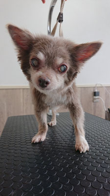 トリミング前はトリマーさんに甘えん坊さんだけどテーブルの上に乗ったら目をしょぼしょぼさせて悲しげなお顔(笑)