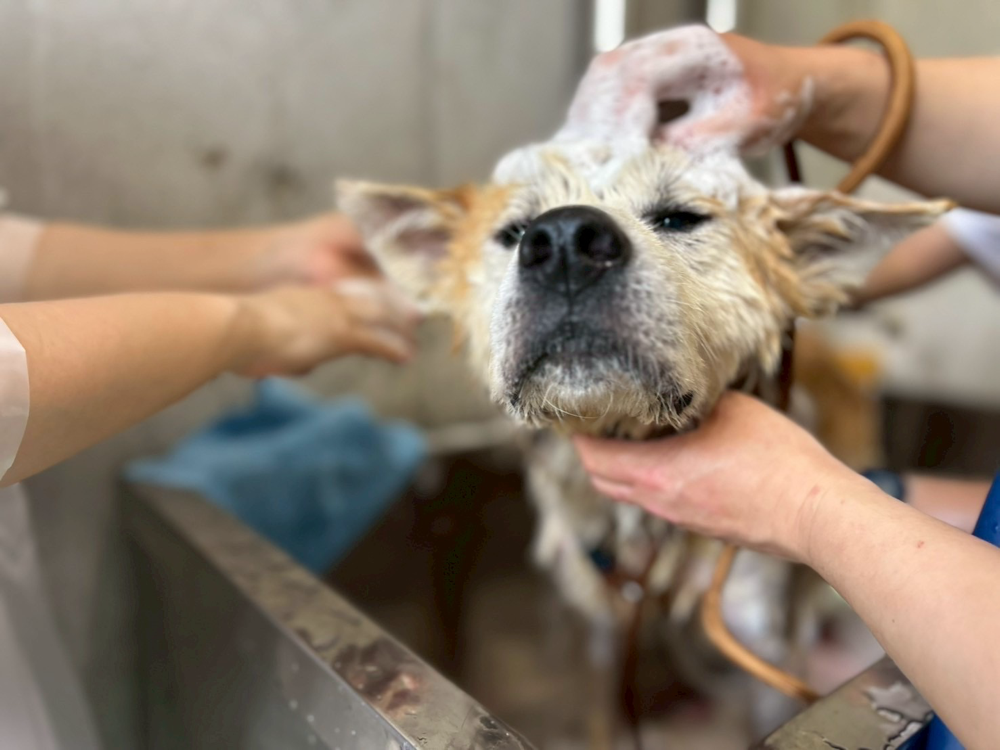 今回はセンターの職員さんから皮膚病がひどい秋田犬をシャンプーして欲しいと言われていたので、まず最初に秋田犬をシャンプーしました。 コテコテの抜け毛に皮膚病で体から出る脂や老廃物などがベタベタにこびり付いて、シャンプーの泡は真っ黒!!皮膚は赤く脱毛していて見るからに痒そうで可哀想でした。...