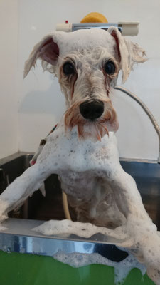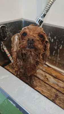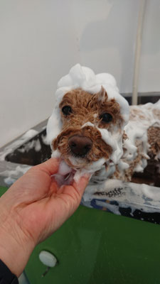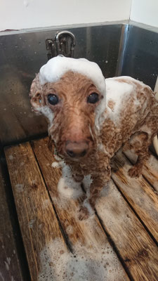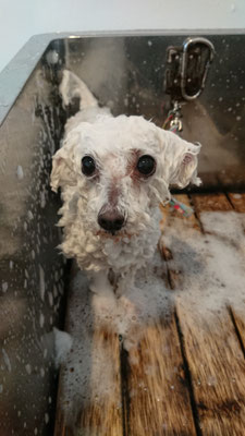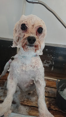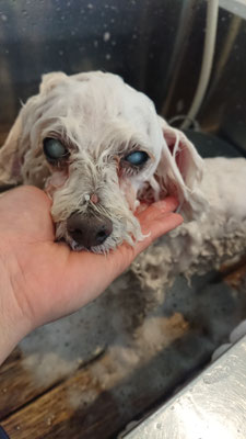 目が見えなくて不安いっぱいのトリミングだけど、シャンプー中だけは気持ちよさそうにウトウトしてくれるロッカちゃん。